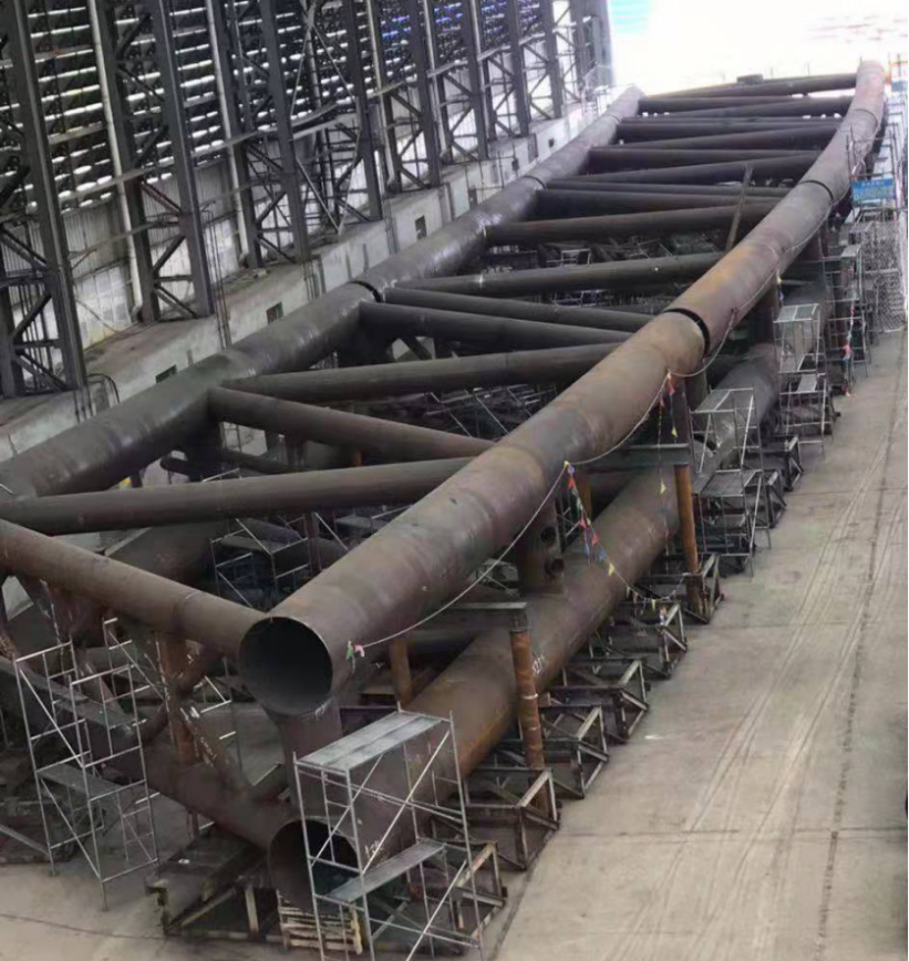 ? 犍為岷江特大橋是公司繼商合杭淮河特大橋、恩施找龍壩特大橋之后承建的又一座特大跨度鋼管混凝土拱橋,主跨457.6米,鋼結(jié)構(gòu)用工程量12000余噸。項(xiàng)目自開工以來公司精心組織,克服了工期緊、任務(wù)重及焊接質(zhì)量要求高等困難,在成熟的施工經(jīng)驗(yàn)基礎(chǔ)上不斷改進(jìn)細(xì)節(jié)、提升設(shè)備能力、優(yōu)化資源配置、完善工藝方案,先后攻克了Q390D-Z25厚鋼板焊接、相貫線焊縫焊接及修磨、拱肋節(jié)段臥式拼裝工藝控制等技術(shù)難題,優(yōu)質(zhì)高效的完成了主拱肋首輪節(jié)段制造和試拼裝施工,為鋼管拱按期合龍奠定了堅(jiān)實(shí)的基礎(chǔ)。
