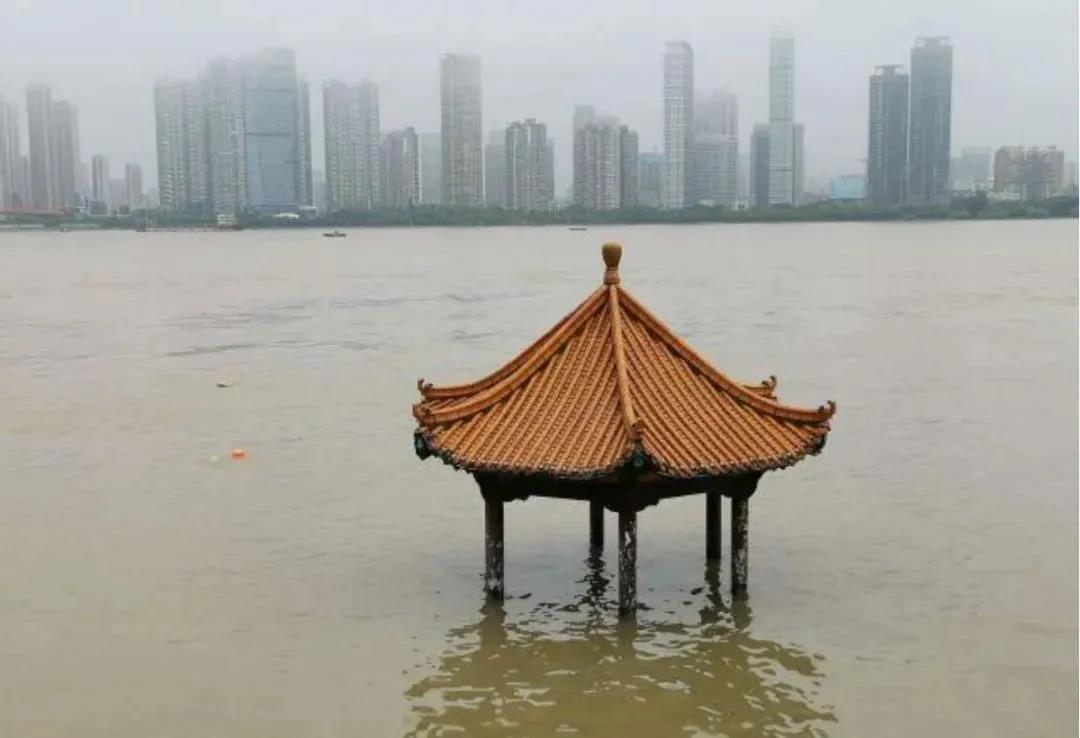 #圖為7月4日武漢武昌江邊黃花嘰親水涼亭,長江洪水已漫上親水平臺(tái),長江武漢段水位超設(shè)防1米,涼亭孤鶩的矗立在滾滾洪流中#