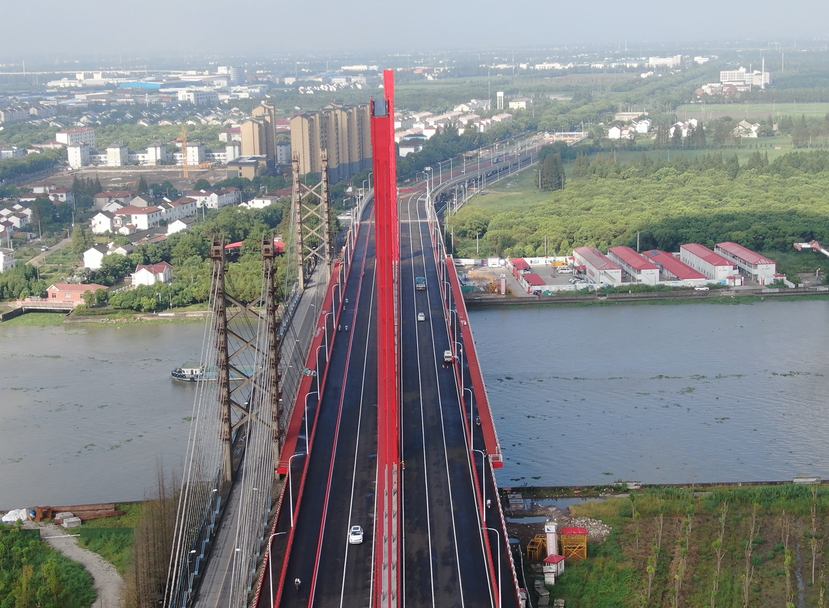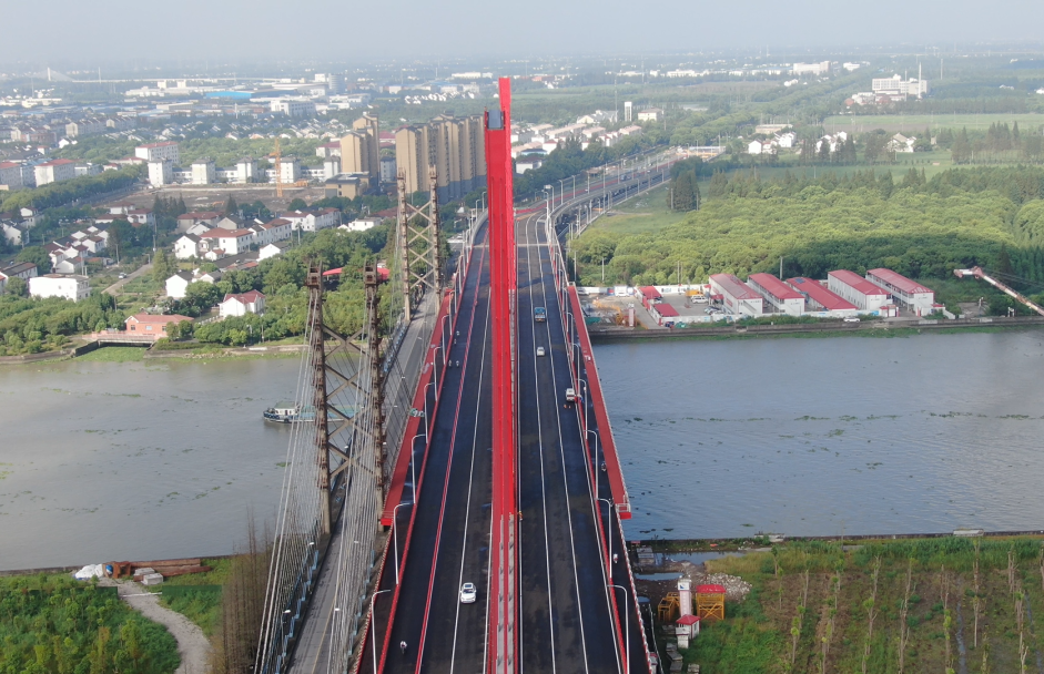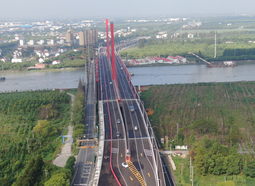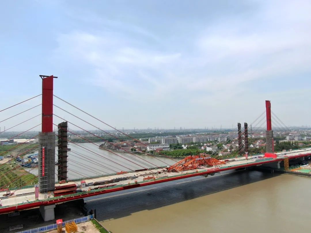 葉新公路泖港大橋工程位于上海市松江區(qū)泖港鎮(zhèn),線路為東西走向,新建泖港大橋于2018年4月動(dòng)工興建,主橋一跨過(guò)河、采用鋼塔鋼箱梁平行單索面斜拉橋,塔梁固接、塔墩分離體系,主橋跨徑445米,其中主跨225米,主塔高60米,主跨寬38.5m,為一級(jí)公路,雙向6車道及人行道、非機(jī)動(dòng)車道。此前,2020年5月20日,新建泖港大橋?qū)崿F(xiàn)主橋合龍。