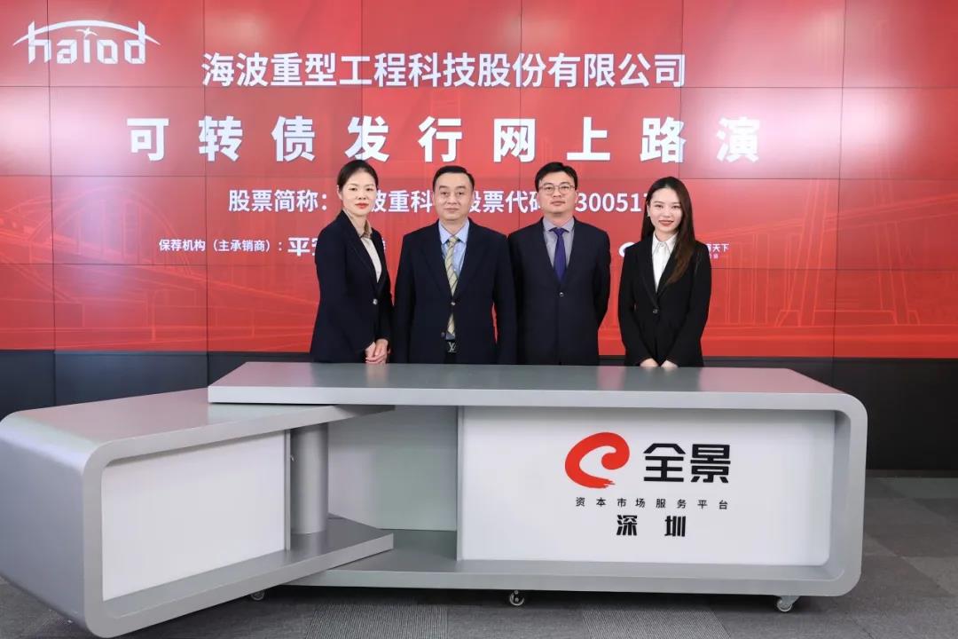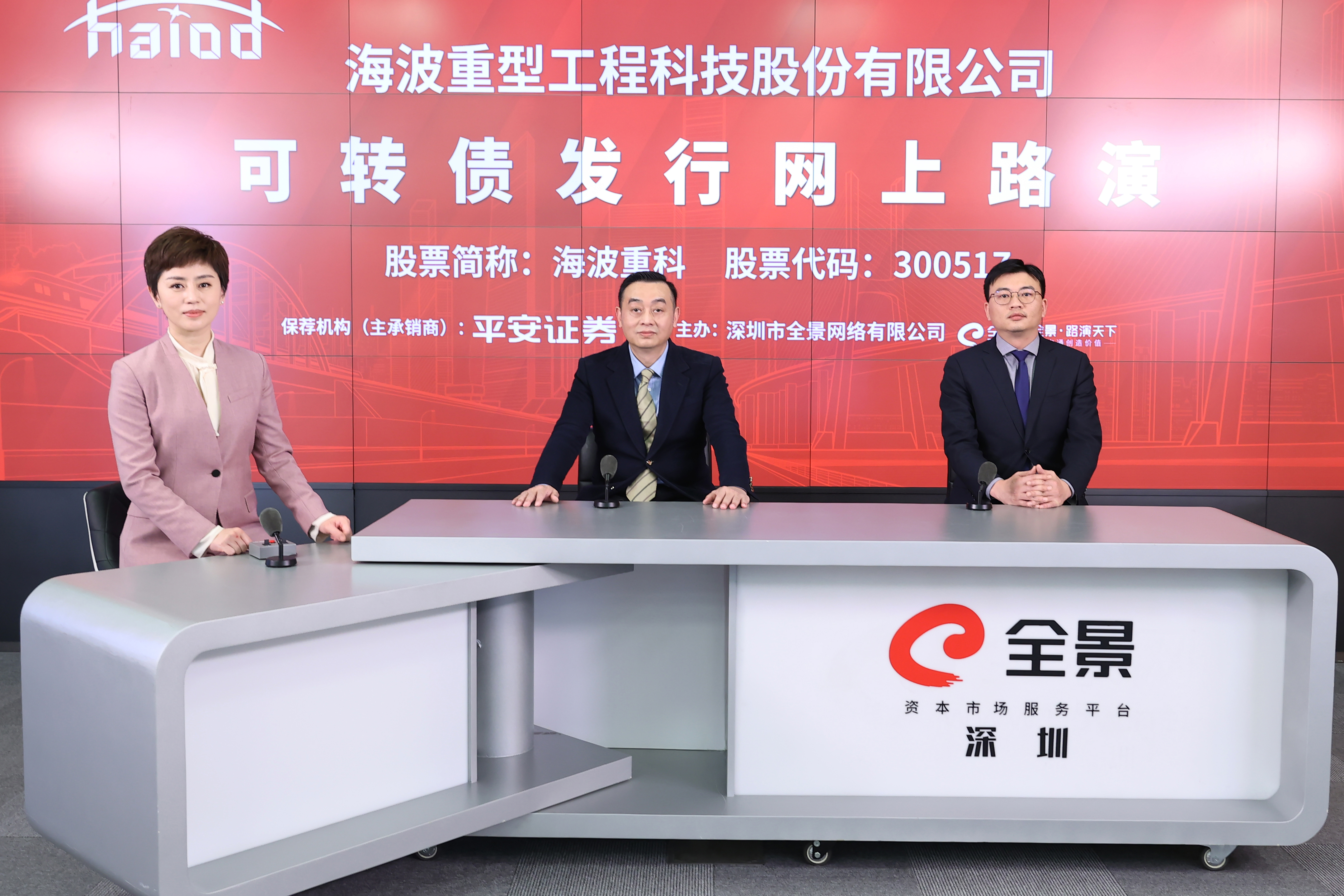 (海波重科新聞報(bào)道)2020年12月01日下午在全景深圳市路演中心,海波重型工程科技股份有限公司向不特定對(duì)象發(fā)行A股可轉(zhuǎn)換公司債券路演活動(dòng)圓滿成功!出席本次網(wǎng)上路演的有公司董事長(zhǎng)張海波先生、董事會(huì)秘書兼財(cái)務(wù)總監(jiān)冉婷女士、財(cái)務(wù)副總監(jiān)楊世珍女士、保薦人(主承銷商)平安證券股份有限公司保薦代表人周協(xié)先生,路演中各位領(lǐng)導(dǎo)就投資者關(guān)心的問題進(jìn)行了詳盡而務(wù)實(shí)的解答。