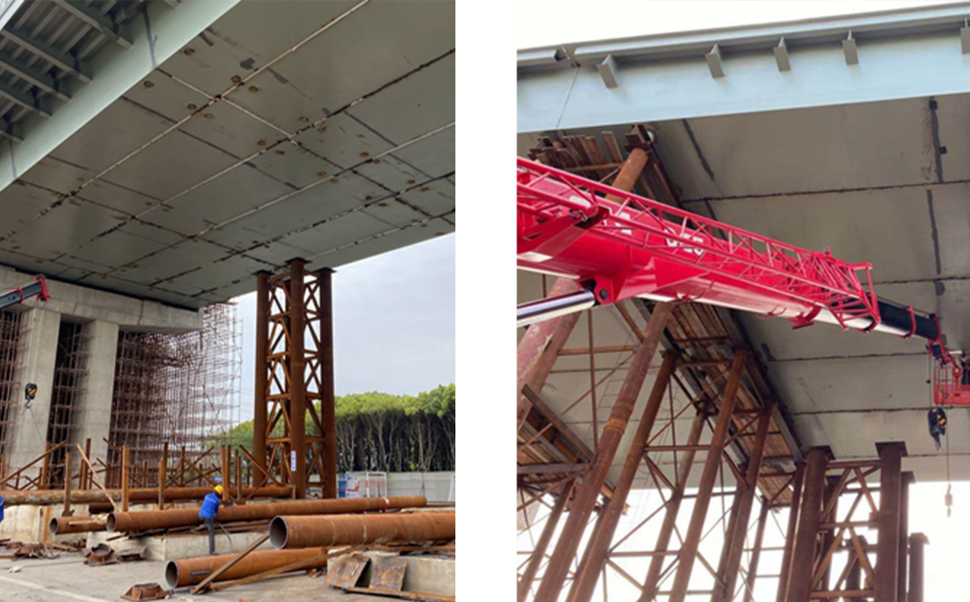 項(xiàng)目主線第四聯(lián)設(shè)計(jì)為三跨等高連續(xù)鋼箱梁頂推施工,是整個(gè)項(xiàng)目中施工難度和施工風(fēng)險(xiǎn)最大的部位,做好施工過(guò)程中的安全防護(hù)以及蘇臺(tái)高速的交通組織是施工的重難點(diǎn)。其原先設(shè)計(jì)采用由北向南頂推過(guò)高速,由于鋼箱梁位于整個(gè)高架橋第四聯(lián),處于上坡段,橋梁縱坡達(dá)到了4%,整個(gè)頂推部分鋼箱梁重量達(dá)到1000噸,按原設(shè)計(jì)方案頂推由北向南,施工難度較大,安全風(fēng)險(xiǎn)高,參建各方集思廣益,不斷優(yōu)化施工組織設(shè)計(jì),將施工方案優(yōu)化為由南向北水平頂推,一次頂推到位,減少地面道路交通導(dǎo)改影響,方案經(jīng)多方論證得以順利實(shí)施。