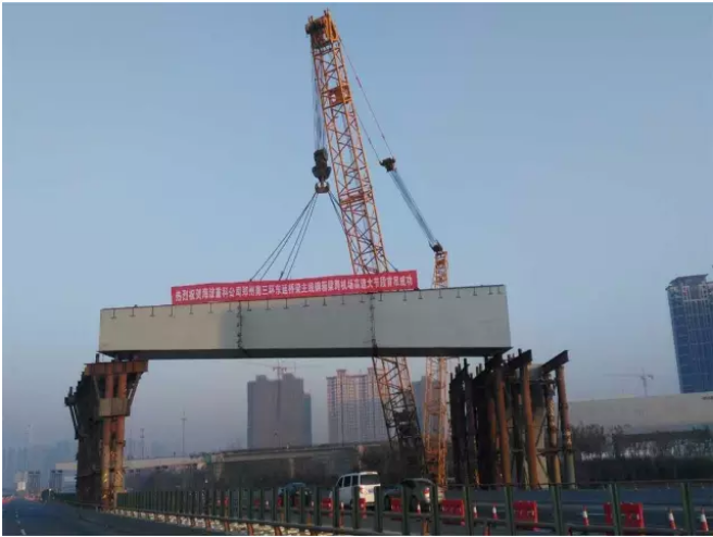 ? ? ? 昨晚,鄭州南三環(huán)二標跨機場高速主線橋鋼箱梁首節(jié)段歷時6小時順利吊裝就位,首吊節(jié)段長度32米,重量123噸,梁高3.8米,上跨機場高速,下穿高壓線吊裝,創(chuàng)下鄭州單節(jié)吊裝重量最大,長度最長,難度最高的鋼箱梁吊裝記錄,預計2016年12月31日可完成全橋鋼箱梁的安裝工作。